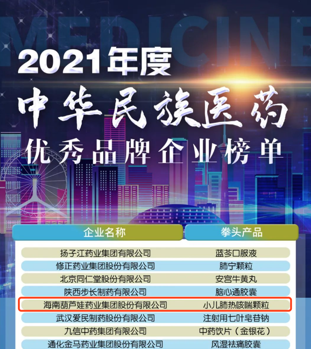 12月29日,全国工商联医药业商会发布了“2021年度中华民族医药优秀品牌企业榜单”,尊龙·Z6药业集团凭借黄金单品小儿肺热咳喘颗粒(4克)实力登榜。